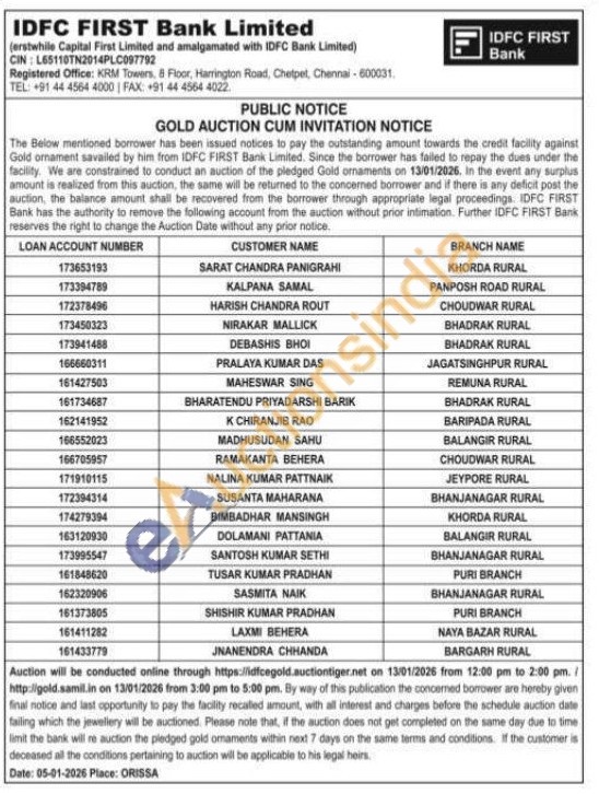 IDFC First Bank Ltd Gold Auctions Auction in Chennai