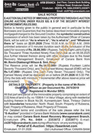 All that part and parcel of the Immovable property comprising an extent of 2.02 Ares of land in Sy. no 1596/4-1 in Velur Village, along with residential building thereon in Block No:26, Kunnamkulam Taluk, Thrissur District with boundaries hereunder. North: Road, South: Property of Rubeena, East: Property of Rubeena, West. Property of Thressia