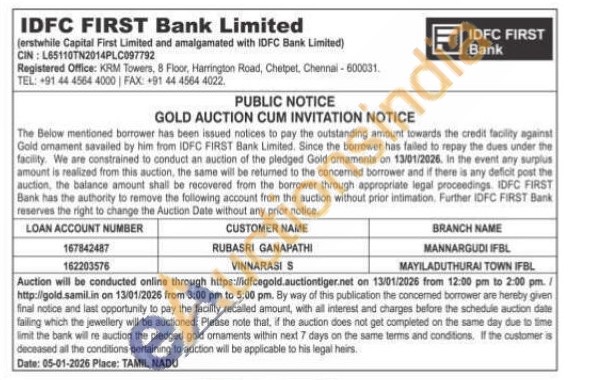 IDFC First Bank Ltd Gold Auctions Auction in Mayiladuthurai