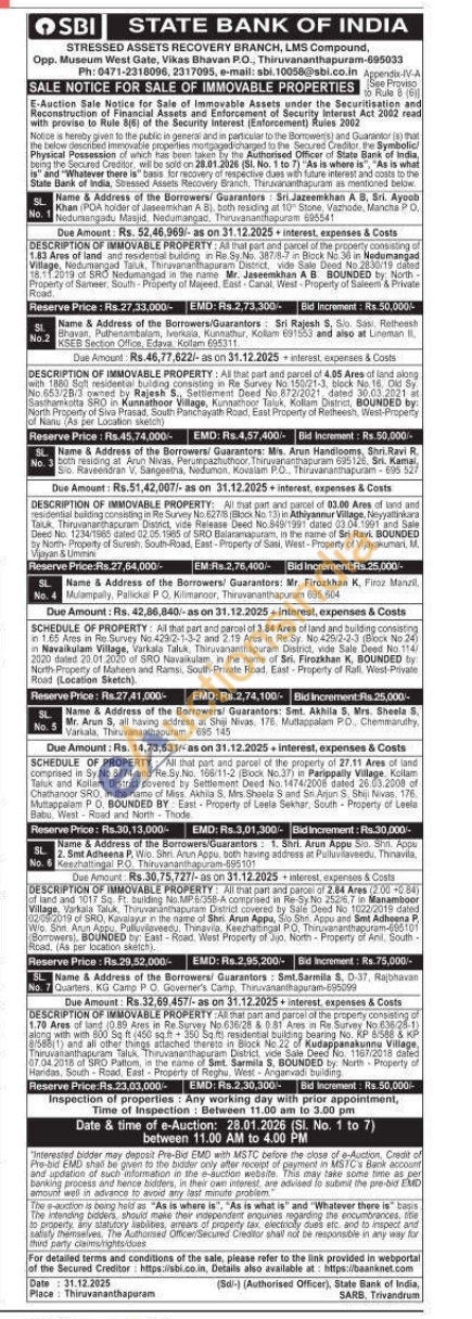 SCHEDULE OF PROPERTY: All that part and parcel of 3.84 Ares of land and building consisting in 1.65 Ares in Re Survey No 429/2-1-3-2 and 2.19 Ares in Re. Sy. No 429/2-2-3 (Block No. 24) in Navaikulam Village, Varkala Taluk, Thiruvananthapuram District, vide Sale Deed No. 114/2020 dated 20.01.2020 of SRO Navalikulam, in the name of Sri. Firozkhan K, BOUNDED by: North-Property of Maheen and Ramsi, South-Private Road, East-Property of Rall, West-Private Road (Location Sketch).