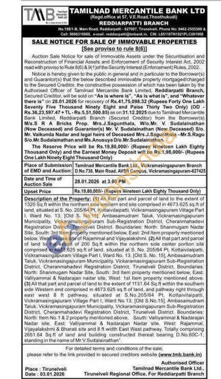 Description of the Property: (1) All that part and parcel of land to the extent of 1320 Sq.ft within the northem side western end site comprised in 4673.625 sq.ft of land, situated at S. No. 205/64 Pt, Kottaivilaipatti, Vickramasingapuram Village Part 1. Ward No. 13, [Old S. No.15]. Ambasamudram Taluk, Vickramasingapuram Municipality, Vickaramasingapuram Sub-Registration District, Cheranmahadevi Registration District, Tirunelveli District. Boundaries: North: Shanmugam Nadar Site, South: 3rd Item property mentioned below, East: 2nd Item property mentioned below, West: House site of Rajammal and Vijayalakshmi. (2) All that part and parcel of land to the extent of 200 Sq.ft within the northern side center portion site comprised in 4673.625 sq.ft of land, situated at S. No. 205/64 Pt, Koftaivilaipatti, Vickramasingapuram Village Part 1, Ward No. 13. [Old S. No. 15), Ambasamudram Taluk, Vickramasingapuram Municipality, Vickaramasingapuram Sub-Registration District, Cheranmahadevi Registration District, Tirunelveli District Boundaries: North: Shanmugam Nadar Site, South: 3rd Item property mentioned below, East: Valliyammal & Nadarajan nadar site, West: 1st Item property mentioned above (3) All that part and parcel of land to the extent of 1131.64 Sq.ft within the southern side Western end comprised in 4673.625 sq.ft of land, and pathway right through east west 8 ft pathway, situated at S.No.205/64 Pt. Kottaivilaipatti, Vickramasingapuram Village Part I, Ward No.13, (Old S.No.15]. Ambasamudram Taluk, Vickramasingapuram Municipality, Vickaramasingapuram Sub-Registration District, Cheranmahadevi Registration District, Tirunelveli District Boundaries: North: Item No. 1 & 2 property mentioned above, South: Valliyammal & Nadarajan Nadar site. East Valliyammal & Nadarajan Nadar site. West: Rajammal, Vijayalakshmi & Bharati site and 8 ft width East West pathway. Totally comprising 2651.54 Sq.ft of land and building constructed thereat bearing D.No. 60C-1, standing in the name of Mr.V.Sudalainathan"