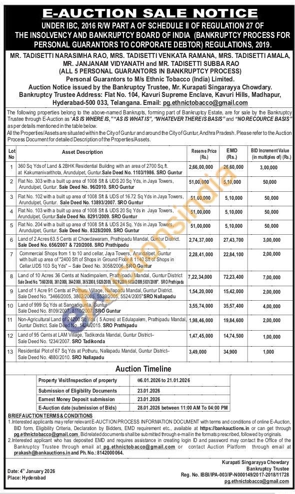 Flat No. 102 with a built up area of 1008 Stt & UDS of 16.72 Sq Yds in Jaya Towers, Arundulpet, Guntur. Sale Deed No. 13893/2007. SRO Guntur