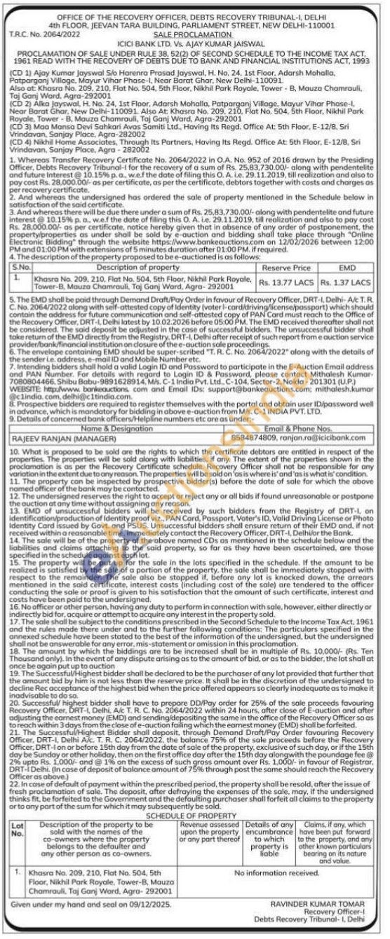 Khasra No. 209, 210. Flat No. 504, 5th Floor, Nikhil Park Royale, Tower-B, Mauza Chamrauli, Taj Ganj Ward, Agra-292001