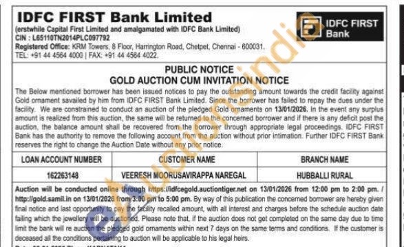 IDFC First Bank Ltd Gold Auctions Auction in Chennai