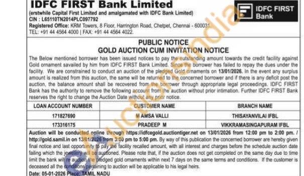 IDFC First Bank Ltd Gold Auctions Auction in Chennai