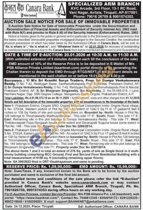 Item-1: Prakasam District, Ongole SRO, Ongole Municipal Corporation limits-Ongole Rural village, S No. 270/2A, Western portion of Plot No. 145. An extent of 1242.5 Sq Ft or 17 gadies 18 feet 6 inches or 138 Sq Yards of site and construction there on. Bounded by: North: House in Plot No. 126 belongs to Thirumalasetty Madhusudanarao-This side 17' 6', South; Road This side 176, East: Remaining site in this plot belongs to Dumpa Venkateswara Reddy This side 71, West: Thelidevulapalli Papa Rangaiah house some extent and Devarapalli Suguna house some extent in Plot No. 146-This side 71. Property under Doc No 2286/2014. Item-2: Prakasam District, Ongole SRO, Ongole Municipal Corporation limits- Ongole Rural village, S No. 270/2A, Eastern portion of Plot No. 145-An extent of 1242.5 Sq Ft or 17 gadies 18 feet 6 inches or 138 Sq Yards of site and construction there on bounded by: North: House in Plot No 126 belongs to Thirumalasetty Madhusudanarao This side 17 6, South: Road This side 17' 6', East: Plot No. 144 belongs to Kota Venkateswarlu - This side 71', West: Remaining site in this plot belongs to Bhojanam Singareddy-This side 71. Property under Doc No 2287/2014.