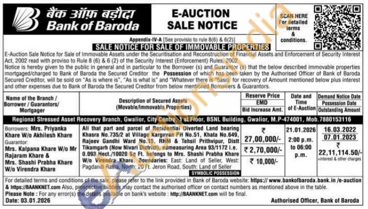 All that part and parcel of Residential Diverted Land bearing Khasra No.735/2 at Village Karguvan PH No.51, Khata No.649, Rajeev Gandhi Ward No.15, RNM & Tehsil Prithvipur, Distt Tikamgarh (Now Nivari District), admeasuring Area 93/1172 i.e. 0.093 Hect./10020 Sq Ft. belongs to Mrs. Shashi Prabha Khare W/o Virendra Khare. Boundaries: East: Land of Seller, West: Pagdandi Rasta, North: 20 Ft. Jeron Road, South: Land of Seller