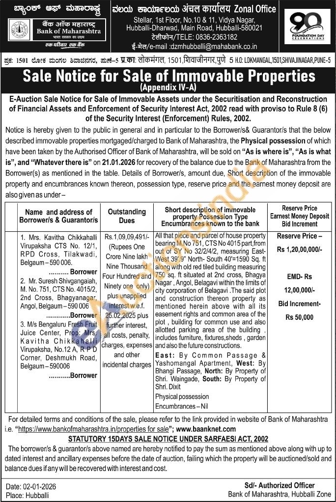 All that piece and parcel of house property bearing M.No 751, CTS No 4015 part, from out of SY No 32/2/4/2, measuring East-West 39.9" North-South 40'=1590 Sq. ft along with old red tiled building measuring 750 sq. ft situated at 2nd cross, Bhagya Nagar, Angol, Belagavi within the limits of city corporation of Belagavi. The said plot and construction thereon property as mentioned herein above with all its easement rights and common area of the plot, building for common use and also allotted parking area of the building includes furniture, fixtures, sheds, garden and also the future constructions.