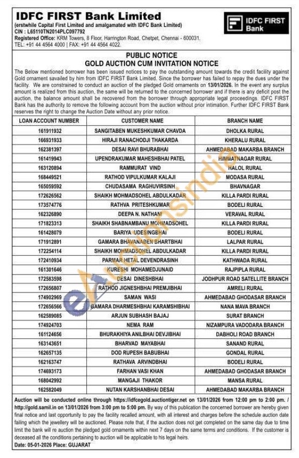 IDFC First Bank Ltd Gold Auctions Auction in Chennai