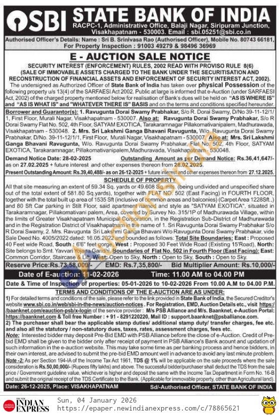 All that site measuring an extent of 59.34 Sq. yards or 49.608 Sq. mts. (being undivided and unspecified share out of the total extent of 581.80 Sq yards), together with FLAT NO 502 (East Facing) in FOURTH FLOOR, together with the total built up area of 1535 Sft (inclusive of common areas and balconies) (Carpet Area 1228Sft.,) and 80 Sft Car parking in Stilt Floor, said apartment named and style as "SATYAM EXOTICA", situated in Tarakaramnagar, Pillakomativani palem, Area, covered by Survey No. 315/1P of Madhurawada Village, within the limits of Greater Visakhapatnam Municipal Corporation, in the Registration Sub-District of Madhurawada and in the Registration District of Visakhapatnam in the name of 1. Sri Ravugunta Dorai Swamy Prabhakar Sio R Doral Swamy, 2. Mrs. Ravugunta Sri Lakshmi Ganga Bhavani Wio Ravugunta Dorai Swamy Prabhakar, vide Sale Deed No. 4005/2022 dated: 16.05.2022 and bounded as follows. Total Site Boundaries: East: Proposed 40 Feet wide Road, South: 6'6" feet gorge, West: Proposed 30 Feet Wide Road (Existing 15'Road), North: Site belongs to Smt. Yavvari Yojana Gandhi. Boundaries of Flat No. 502 in Fourth Floor (East Facing); East: Common Corridor, Staircase & Lift, West: Open to Sky, North: Open to Sky, South: Open to Sky