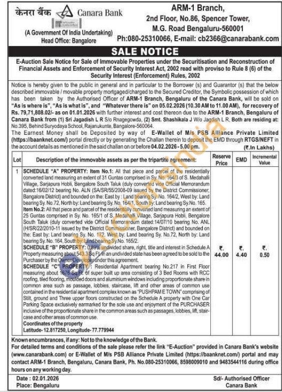SCHEDULE "A" PROPERTY: Item No.1: All that piece and parcel of the residentially converted land measuring an extent of 31 Guntas comprised in Sy. No. 164/3 of S. Medahalli Village, Sarjapura Hobli, Bengalore South Taluk (duly converted vide Official Memorandum dated: 16/02/12 bearing No. ALN (SA/SR/55/2008-09 issued by the District Commissioner, Bangalore District) and bounded on the East by: Land bearing Sy. No. 164/2, West by: Land bearing Sy. No. 72, North by: Land bearing Sy. No. 164/1, South by: Land bearing Sy No. 165. Item No.2: All that piece and parcel of the residentialy converted land measuring an extent of 25 Guntas comprised in Sy. No. 165/1 of S. Medahalli Village, Sarjapura Hobli, Bengalore South Taluk (duly converted vide Official Memorandum dated: 14/07/10 bearing No. ANL (H/SR/22/2010-11 issued by the District Commissioner, Bangalore District) and bounded on the: East by: Land bearing Sy. No. 172, West by: Land bearing Sy. No.72, North by: Land bearing Sy. No. 164, South by: Land bearing Sy No. 165/2SCHEDULE "B" PROPERTY: 0.89% undivided share, right, title and interest in Schedule A Property measuring about 543.3 Sq Ft. in an undivided state has been agreed to be sold to the Purchaser by the Owner/Developer under this agreement.SCHEDULE "C" PROPERTY: Residential Apartment bearing No.217 in First Floor measuring about 1676 Sq Ft. of super built up area consisting of 3 Bed Rooms with RCC roofing, tiled flooring, moulded doors and aluminium windows including proportionate share in common area such as passage, lobbies, staircase, lift and other areas of common use contained in the residential apartment complex known as "PUSHPAME TOWN" comprising of Stilt, ground and Three upper floors constructed on the Schedule A property with One Car Parking Space exclusively earmarked for the sole use and enjoyment of the PURCHASER inclusive of the proportionate share in the common areas such as passages, lobbies, lift, stair-case and other areas of common use.