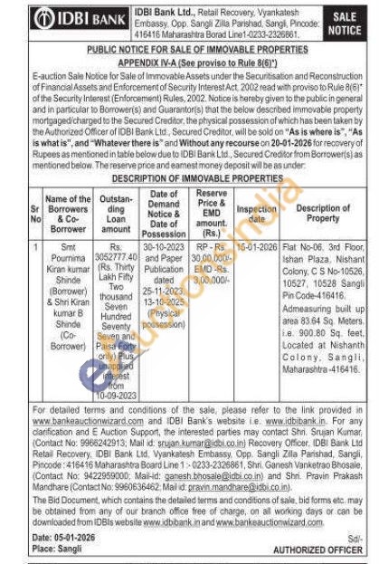 Flat No-06 3rd Floor, Ishan Plaza, Nishant Colony, C S No-10526, 10527, 10528 Sangli Pin Code-416416 Admeasuring built up area 83.64 Sq Meters e. 900.80 Sq. feet. Located at Nishanth Colony. Sangli, Maharashtra-416416.