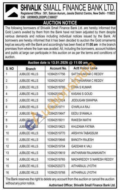 Shivalik Small Finance Bank Ltd Gold Auctions Auction in New Delhi