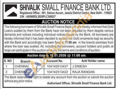 Shivalik Small Finance Bank Ltd Gold Auctions Auction in New Delhi