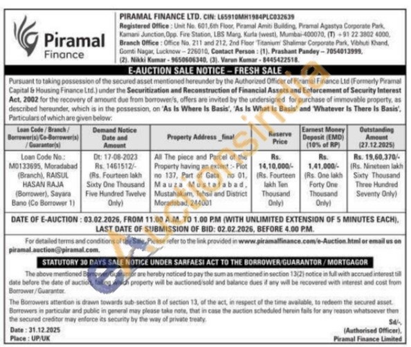 All The piece and Parcel of the Property having an extent:-Plot no 137, Part of Gata no 01, Mauza Mustafabad, Mustahakam, Tehsil and District Moradabad, 244001