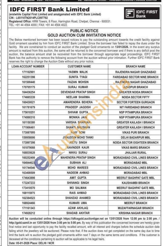 IDFC First Bank Ltd Gold Auctions Auction in New Delhi