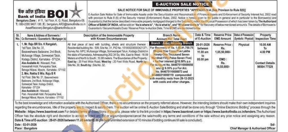 All that piece of land with building, sheds and structure thereon: Residential bulding No.: 509, Site No. 31, PID No. 151800208300421371, Survey No. 6/P2, Mullusoge Village, Somwarapet Taluk, Kodagu District in the state of Kamataka, Admeasuring 202.34 Sq. Mts, East to West: 18.59 Meters and North to South: 10.88 meters. The Boundaries of the Property: East by: 20 Feet Wide Road, West by: 20 Feet Wide Road, North by: Site No. 30, South by: Sile No. 32.