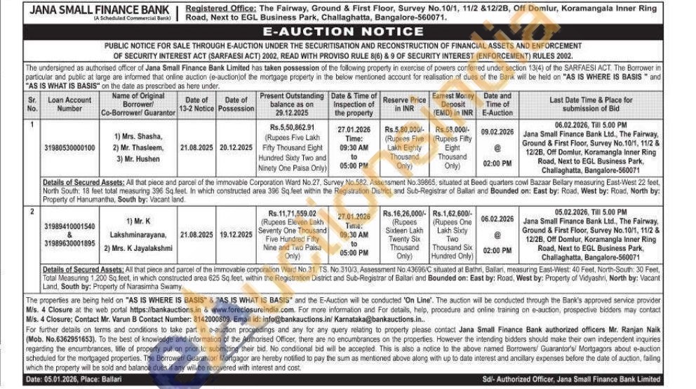 Details of Secured Assets: All that piece and parcel of the immovable corporation Ward No.31, TS. No. 310/3, Assessment No. 43606/C situated at Bathri, Ballari, measuring East-West: 40 Feet, North-South: 30 Feet, Total Measuring 1.200 Sq feet, in which constructed area 625 Sq feet, within the Registration District and Sub-Registrar of Ballari and Bounded on: East by: Road, West by: Property of Vidyashri, North by: Vacant Land, South by: Property of Narasimha Swamy.
