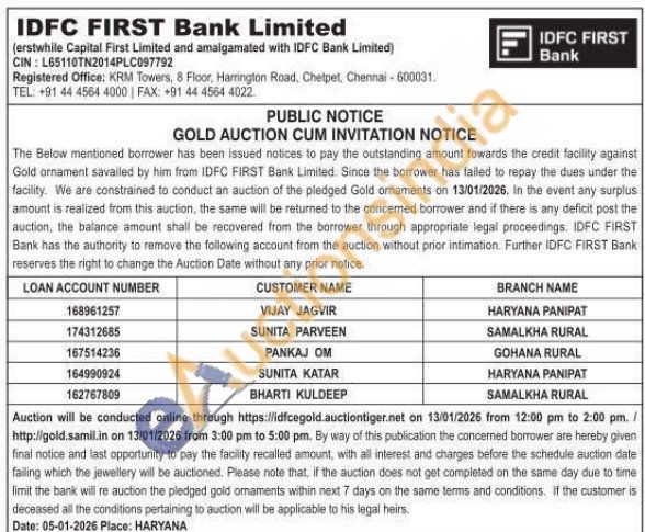 IDFC First Bank Ltd Gold Auctions Auction in Panipat