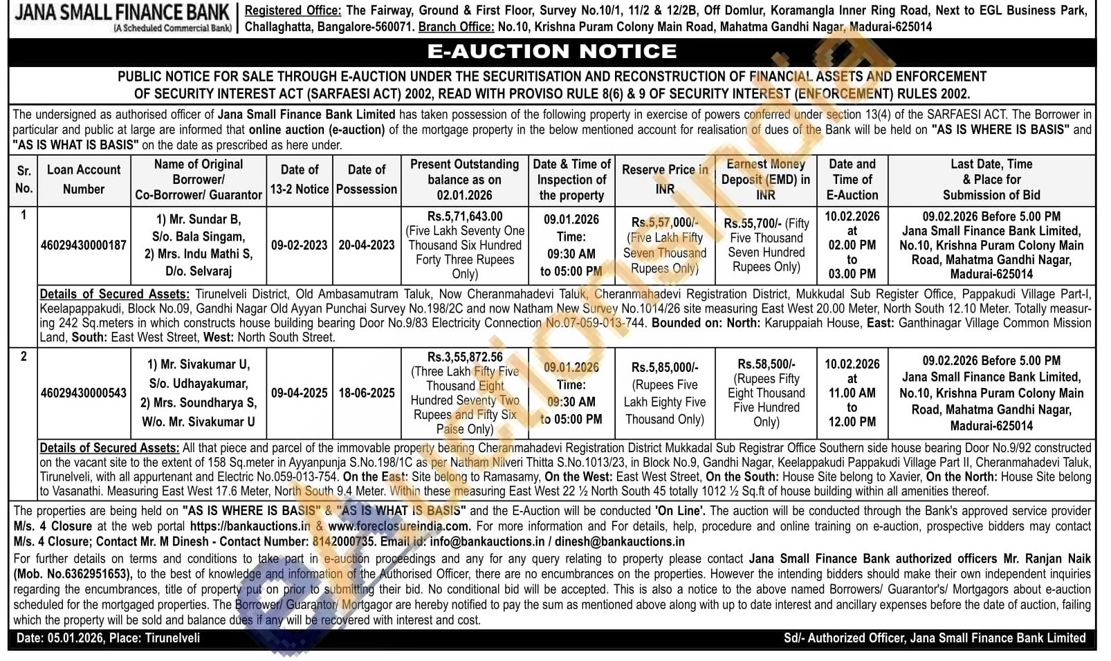 Details of Secured Assets: Tirunelveli District, Old Ambasamutram Taluk, Now Cheranmahadevi Taluk, Cheranmahadevi Registration District, Mukkudal Sub Register Office, Pappakudi Village Part-I, Keelapappakudi, Block No.09, Gandhi Nagar Old Ayyan Punchai Survey No. 198/2C and now Natham New Survey No. 1014/26 site measuring East West 20.00 Meter, North South 12.10 Meter. Totally measur-ing 242 Sq.meters in which constructs house building bearing Door No.9/83 Electricity Connection No.07-059-013-744. Bounded on: North: Karuppaiah House, East: Ganthinagar Village Common Mission Land, South: East West Street, West: North South Street.
