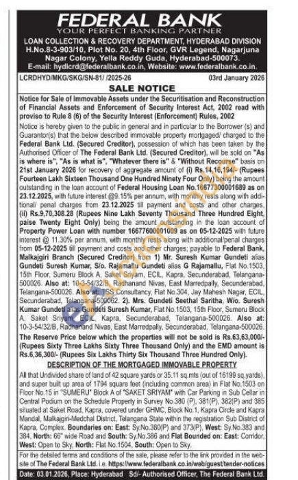 All that Undivided share of land of 42 square yards or 35.11 sq.mts (out of 16199 sq yards), and super built up area of 1794 square feet (including common area) in Flat No.1503 on Floor No: 15 in "SUMERU" Block A of "SAKET SRIYAM" with Car Parking in Sub Cellar in Central Podium on the Schedule Property in Survey No 380 (P), 381(P), 382(P) and 385 situated at Saket Road, Kapra, covered under GHMC, Block No. 1, Kapra Circle and Kapra Mandal, Malkajgiri-Medchal District, Telangana State within the registration Sub District of Kapra, Complex. Boundaries on: East: Sy.No.380(P) and 373(P), West: Sy.No.383 and 384, North: 66" wide Road and South: Sy.No.386 and Flat Bounded on: East: Corridor, West: Open to Sky, North: Flat No. 1504, South: Open to Sky,