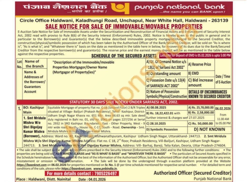 Equitable Mortgage of property Flat no. C-18 (Second Floor) 2 8/R Triplex situated at Village-Bailjuri (Prakash Residency), Tehsil- Kashipur, District-Udham Singh Nagar Khasra no. 651. Min. Area 86.63 sq mtr. Sale deed duly registered in Bahi no. 01, zild no. 8041 on pages 227/256 at Serial no. 2932 in SRO Kashipur. Boundaries: East Other Property, West-9 mtr wide road, North-House no. C-17, South Road. Ownership - Smt. Mridula Mishra W/o Sh. Digvijay Kumar Mishra.