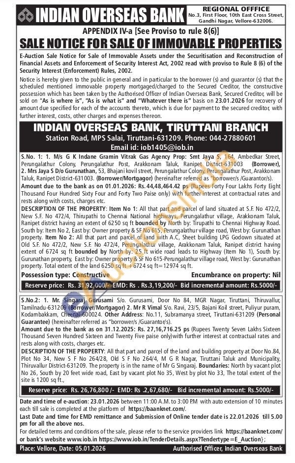 DESCRIPTION OF THE PROPERTY: Item No 1: All that part and parcel of land situated at S.F. No 472/2, New S.F. No 472/4, Thirupathi to Chennai National highways, Perungalathur village, Arakkonam Taluk, Ranipet district having an extent of 6250 sq ft bounded by North by: Tirupathi to Chennai Highway Road. South by: Item No 2, East by: Owner property & SF No 615, Perungalathur village road, West by: Gurunathan property. Item No 2: All that part and parcel of land with A.C, Sheet building LPG Godown situated at Old S.F. No 472/2, New S.F. No 472/4, Perungalathur village, Arakkonam Taluk, Ranipet district having extent of 6724 sq ft bounded by North by: 25 ft wide road leads to Highway (Item No 1), South by: Gurunathan property, East by: Owner property & SF No 615-Perungalathur village road, West by: Gurunathan property. Total extent of the land 6250 sq ft +6724 sq ft=12974 sq ft