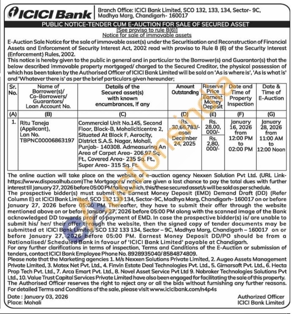 Commercial Unit No.145, Second Floor, Block-B, Mohaliciticentre 2, Situated At Block F, Aerocity, District S.A.S. Nagar, Mohali, Punjab-140308. Admeasuring An Area of Carpet Area-206.97 Sq. Ft., Covered Area- 235 Sq. Ft., Super Area-315 Sq. Ft.