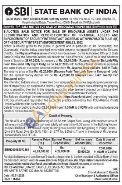 Flat No 809, 8 th Floor, admeasuring 46.08 Sq.mtr Carpet Area along with enclosed area of admeasuring 2.28 sq.mtr. Carpet area totally admeasuring 48.36 sq.mtr in the Building Known as SAI SHRUSHTI HERITAGE being Building no A situated and lying being at Village Dawie, Diva Shil Road, Diva (E) S.No 136/1-E. 137/4 Tal. & District Thane in the name of Mr. Jayanta Tudu and Mrs. Sai H Tudu