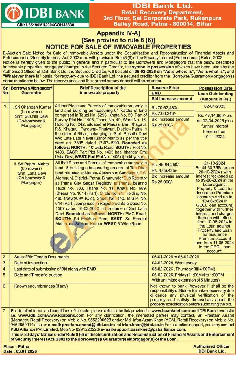 All that Piece and Parcels of immovable property le land & building admeasuring an area of Ten Dhur land, situated at Mauza-Alakaspur, Sandalpur, P.S. Alamgunj, District-Patna, Bihar under Sub Registry at Patna City Sadar Registry at Patna, bearing Tauzi No. 303, Thana No. 11, Khata No. 689, Khesra No. 1014 (Part), Circle No. 71, Holding No. 485 (New)/69A (Old), Sheet No. 140, M.S.P. No. 614 (Part), comprised in Registered Sale Deed No. 1567 dated 16-03-2000 in the name of Smt Lalta Devi. Bounded as follows: NORTH: PMC Road, SOUTH: Sri Makhan Ram, EAST: Sri Sheetal Mahto and Sri Arun Kumar, WEST: 6' Wide Road