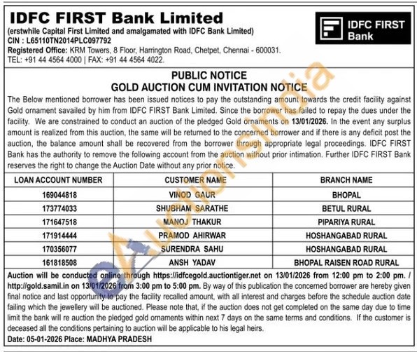 IDFC First Bank Ltd Gold Auctions Auction in Chennai