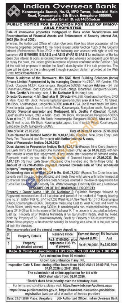 Property Owner Name: Mr. Sri Sudhakar R Equitable Mortgage followed by Registered memorandum of all that piece and parcel of the residential Property bearing site no. 21, BBMP PID No. 67-11-21,Old Ward No. 67, New Ward No. 151 of Koramangala Village Koramangala-560096, Bangalore measuring East to West 60 feet and North to South 55 feet, totally measuring 3300 sq. ft. consisting of a non-residential building meas uring GF-2400 sq. ft. in the name of Sri Sudhakar R. The property is bounded as follows: East by: Properly of Sri Krishna Munireddy & Sri Gurumurthy Reddy, West by: Road, North by: Property of Sri Ramaswamyreddy, South by Property of Sri Jayaramareddy Note: Above property is the common security for housing loan account in the joint name of both the directors.