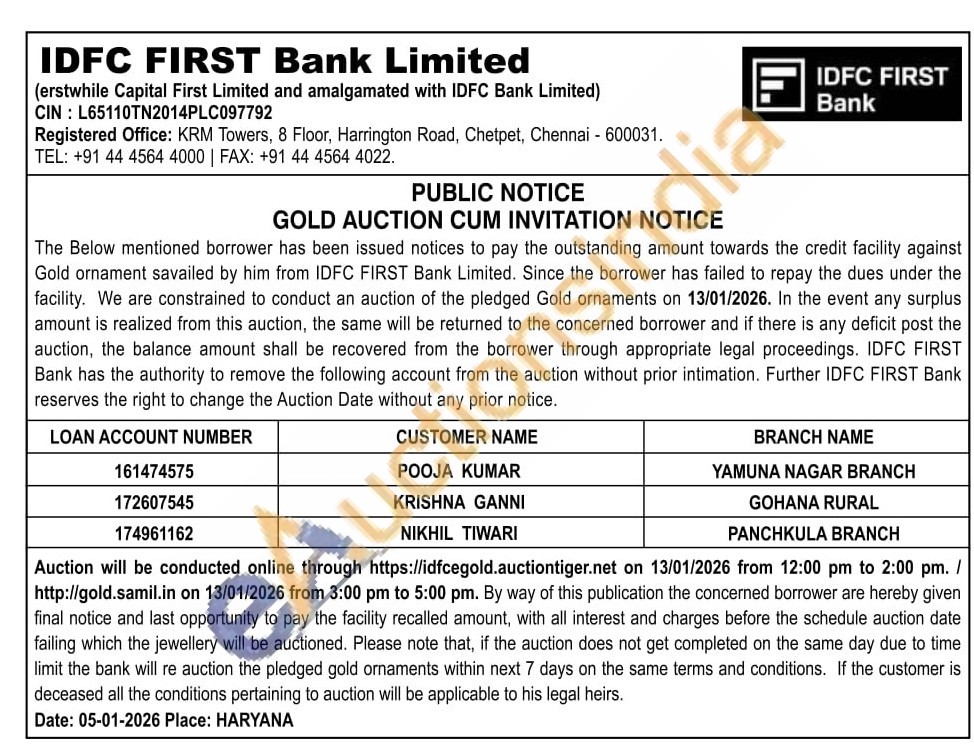 IDFC First Bank Ltd Gold Auctions Auction in Chennai