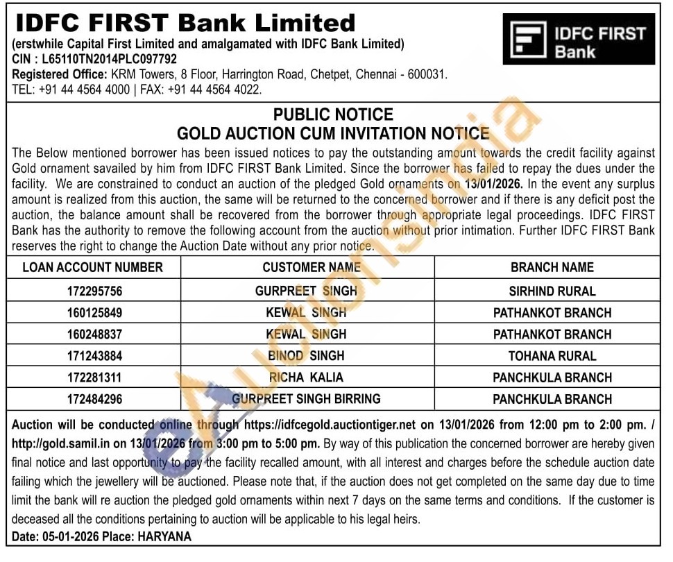 IDFC First Bank Ltd Gold Auctions Auction in Chennai