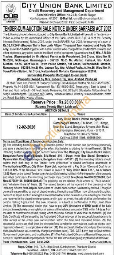 All that Piece and Parcel of Property Bearing Old Municipal Khatha No 130/1452/24850, Property No. 14-2-506-56/1, Assessment No. 130/1452/2485C. Measuring, East to West-12 Feet and North to South-38 Feet. Totally Measuring 456.00 Sq.Ft. Situated at Nalbandwadi 1st Stage, Ramanagara. Bounded on: East by: House of Babul, West by: House of Aslam. North by Road, South by: House of israq