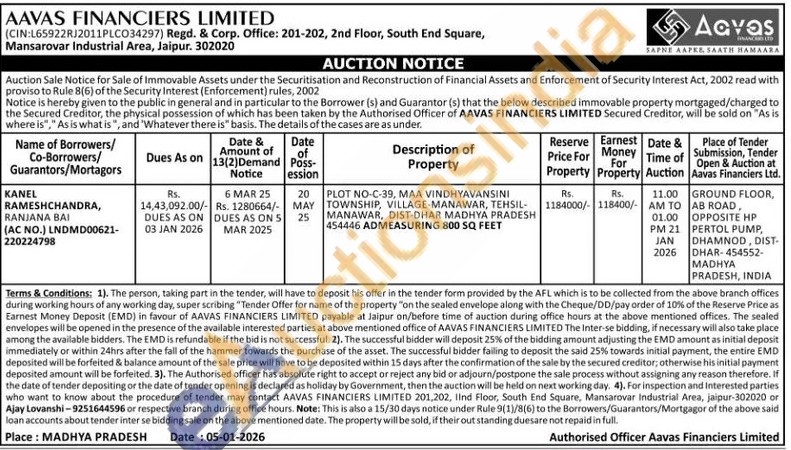 PLOT NO-C-39, MAA VINDHYAVANSINI TOWNSHIP, VILLAGE-MANAWAR, TEHSIL-MANAWAR, DIST-DHAR MADHYA PRADESH 454446 ADMEASURING 800 SQ FEET