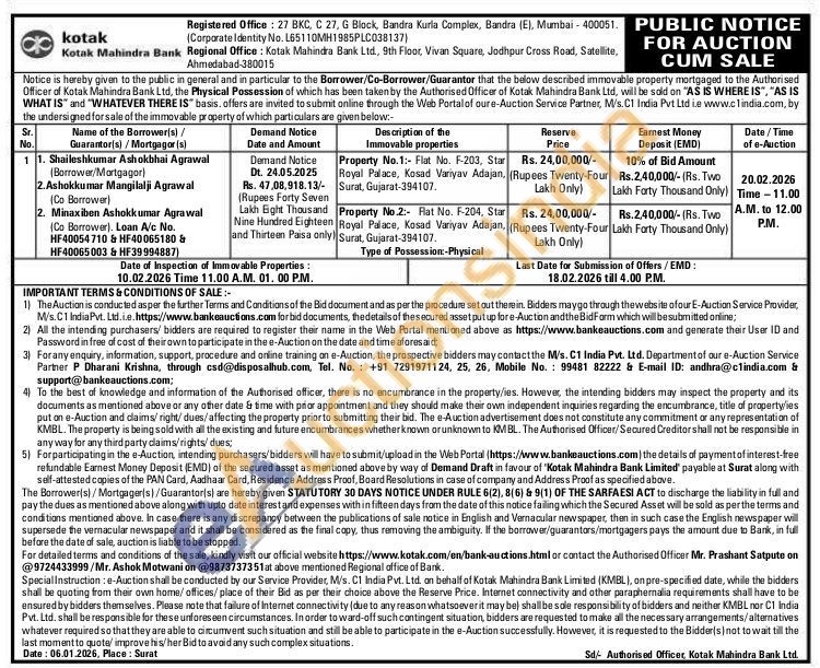 Property No.1:- Flat No. F-203, Star Royal Palace, Kosad Variyav Adajan, Surat, Gujarat-394107.