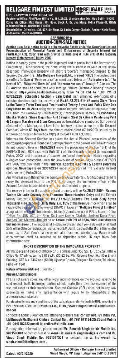 All that piece and parcel of Office No. 16, admeasuring 350 Sq. Ft. (32:52 So. Mtr) & Office No.17 admeasuring 350 Sq Ft. (32.52 Sq. Mtr) Ground Floor, Hari Om Shanti Building, CTS No. 5467 and (5466) Jijamata Chowk, Talegaon Dabhade, Tal-Maval, Pune-411041.