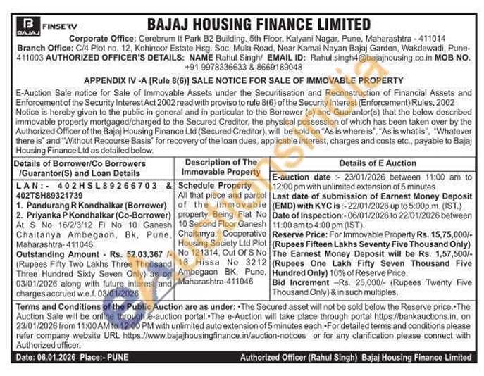 Schedule Property All that piece and parcel of the immovable property Being Flat No 10 Second Floor Ganesh Chaitanya, Cooperative Housing Society Ltd Plot No 121314, Out Of S No 16 Hissa No 3212 Ambegaon BK, Pune, Maharashtra-411046