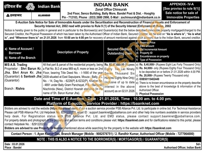 All that part & parcel of the residential property, being a Flat No. B-2 of area 969 sq.ft. more or less on 2nd Floor, bearing Title Deed No. 1-1690 of the year 2009 situated at East Sapuipara, Mouza - Bally, J.L. No. - 14, Dag No.-6228(P) & 6232(P), Khatian No. -4891 under Bally Gram Panchayat, P.S. - Bally(old) Nischinda (New), District Howrah standing (In the name of Sh. Barun Kumar Jha).