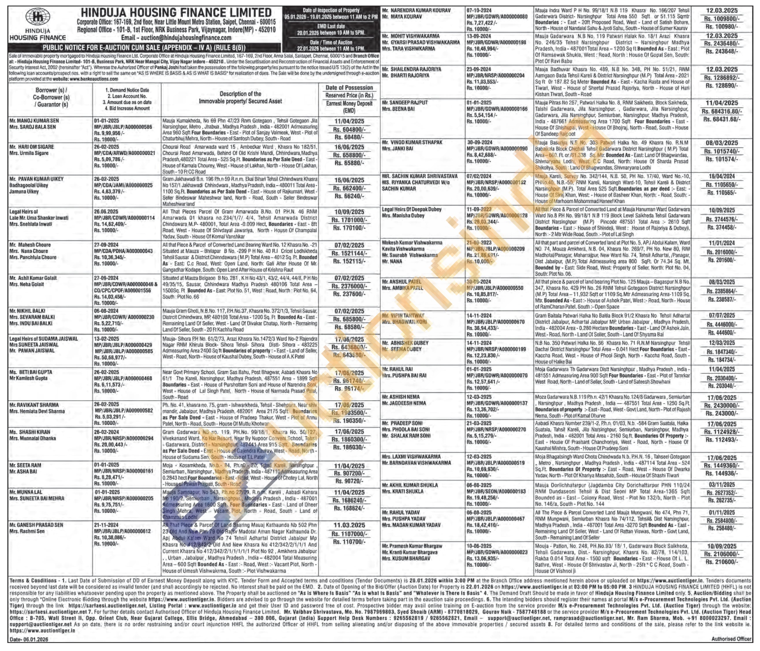 contact Authorised Officer of Hinduja Housing Finance Limited. Mr. Vaibhav Shrivastava, Mo. No. 7987969803, Syed Shoaib (ARM)-8770818029, Gourav Naik-7587748188
