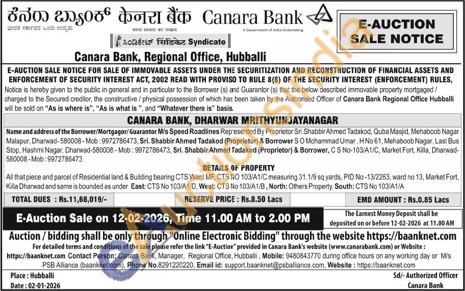 All that piece and parcel of Residential land & Building bearing CTS Ward MF, CTS NO 103/A1/C measuring 31.1/9 sq yards, PID No-13/2263, ward no 13, Market Fort, Killa Dharwad and same is bounded as under East: CTS No 103/A1/D, West: CTS No 103/A1/B, North: Others Property, South: CTS No 103/A1/A
