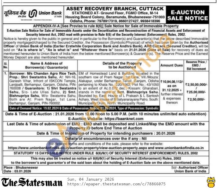 EM of Homestead Land & Building situated in the southern row of Prem Nagar, 1st Lane, Vill./Mouza: Alakapur, under Berhampur Tehsil, Ganjam, Odisha pertaining to Khata No.: 220/1563, Plot No.: 43/1050 to an extent of Ac.0.072 dec., Kissam: Gharabari, stands in the name of Smt. Bishnupriya Sahu. Bounded by- East: House of L Prakash & L Santosh Achary, West: House of B Satyanarayana Patro, South: Municipality Drain, North: Municipality Road.