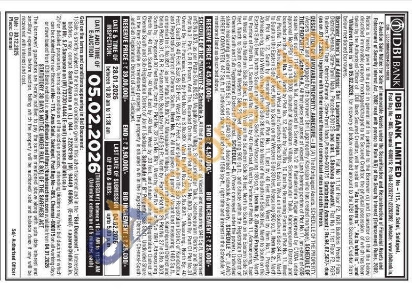 DESCRIPTION OF IMMOVABLE PROPERTY: ANNEXURE-1B (A) The Mortgaged Assets, SCHEDULE OF THE PROPERTY, (Assets owned and mortgaged by the borrower Shri Logamoorthy Kasirajan who has created mortgage), SCHEDULE OF THE PROPERTY-1, Schedule A, All that piece and parcel of Vacant Land bearing portion of Plot No.11, an extent of 689 square feet out of 1140 Square feet, comprised in Survey No.1/2 in Ramakrishna Nagar (approved by CMDA under approval No.PPD/LO No.14/2000) situated at Kolapakkam Village, Sriperumbudur Taluk, Kancheepuram District, and bounded on the, Item No. 1:, North by Plot No. 12, South by Plot No. 10, East by Remaining Portion of Plot No. 11, West by Plot No. 18, Admeasuring, East to West on the Northern Side 30 feet, East to West on the Southern Side 34 feet, North to South on the Eastern Side 30 feet, North to South on the Western Side 30 feet, Measuring 960 sq.ft., Item No. 2:, North by Plot No. 12, South by Remaining Portion of Plot No. 11, East by 40 Feet Road, West by Item No.1. Property Admeasuring, East to West on the Northern Side 36 feet, East to West on the Southern Side 36 feet, North to South on the Eastern Side 5 feet, North to South on the Western Side 5 feet Measuring 180 sq.ft., Item No. 3: (Devaraj Property), North by Portion of Plot No. 11, South by Plot No. 10, East by 40 Feet Road, West by Portion of Plot No. 11, Admeasuring, East to West on the Northern Side 36 feet, East to West on the Southern Side 36 feet, North to South on the Eastern Side 25 feet, North to South on the Western Side 25 feet, Measuring 900 sq.ft., and situate within the Registration District of Chennai South and Sub Registration District of Pammal, SCHEDULE-B, (Power conveyed under the power). Undivided share measuring an extent of 1589 Sq. Ft. out of 2040 Sq. Ft. described in schedule A property, SCHEDULE "C", (LAND HEREBY CONVEYEDI, 447 Sq.ft. of Undivided share, of land out of 1589 sq-ft, right title and interest in the Schedule "A" mentioned land as described above.