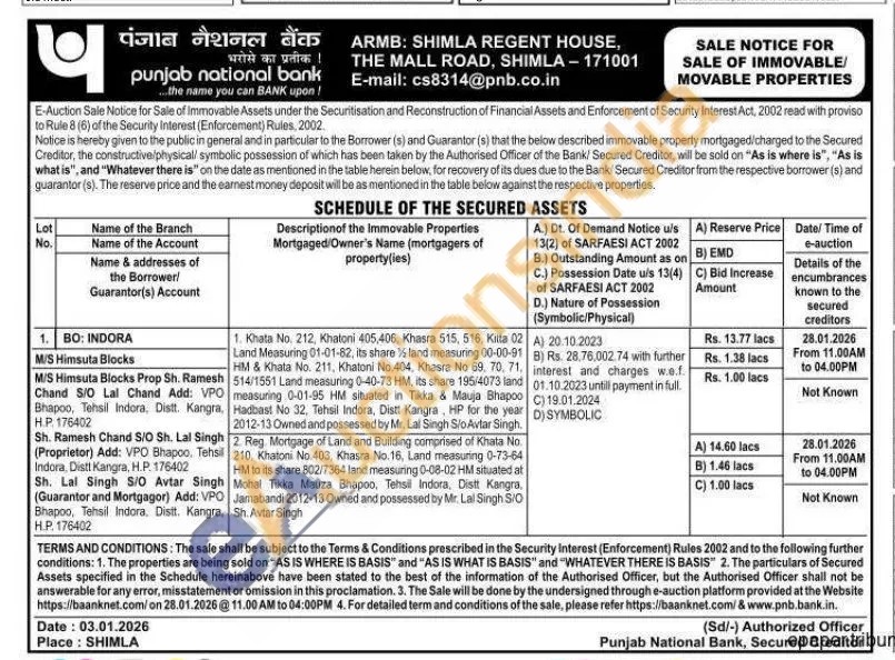 Reg. Mortgage of Land and Building comprised of Khata No. 210, Khatoni No.403, Khasra No. 16, Land measuring 0-73-64 HM to its share 802/7364 land measuring 0-08-02 HM situated at Mohal Tikka Mauza Bhapoo, Tehsil Indora, Distt Kangra, Jamabandi 2012-13 Owned and possessed by Mr. Lal Singh S/O Sh. Avtar Singh