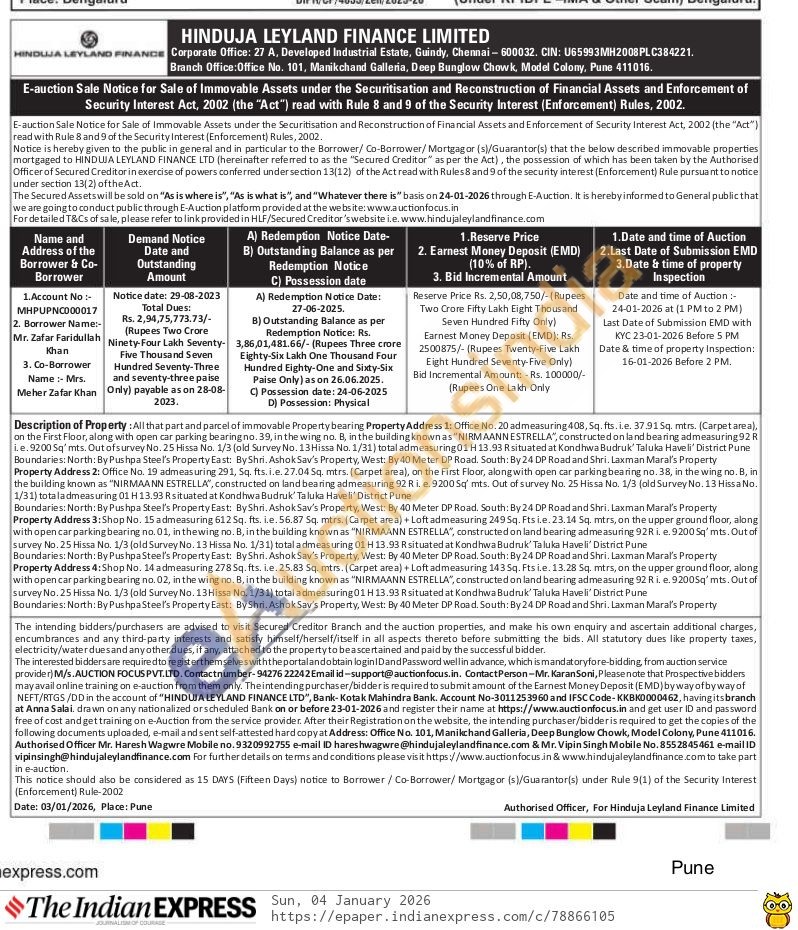 All that part and parcel of immovable Property bearing Property Address 1: Office No. 20 admeasuring 408, Sq. fts, i.e. 37.915q. mtrs. (Carpetarea), on the First Floor, along with open car parking bearing no. 39, in the wing no. B, in the building known as "NIRMAANN ESTRELLA", constructed on land bearing ad measuring 92 R i.e. 9200 Sq' mts. Out of survey No. 25 Hissa No. 1/3 (old Survey No. 13 Hissa No. 1/31) total admeasuring 01 H 13.93 R situated at Kondhwa Budruk' Taluka Haveli District Pune Boundaries: North: By Pushpa Steel's Property East: By Shri. Ashok Sav's Property, West: By 40 Meter DP Road, South: By 24 DP Road and Shri. Laxman Maral's Property Property Address 2: Office No. 19 admeasuring 291, Sq. fts. i.e. 27.04 Sq. mtrs. (Carpet area), on the First Floor, along with open car parking bearing no. 38, in the wing no. B, in the building known as "NIRMAANN ESTRELLA", constructed on land bearing admeasuring 92 R i. e. 92005q' mts. Out of survey No. 25 Hissa No. 1/3 (old Survey No. 13 Hissa No. 1/31) totaladmeasuring 01 H 13.93 R situated at Kondhwa Budruk' Taluka Haveli' District Pune