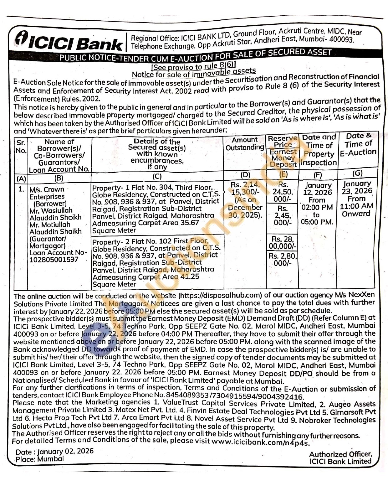 Property- 2 Flat No. 102 First Floor, Globe Residency, Constructed on C.T.S. No. 908, 936 & 937, at Panvel, District Raigad, Registration Sub-District Panvel, District Raigad, Maharashtra Admeasuring Carpet Area 41.25 Square Meter
