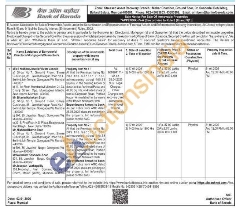 All that the Premises, being No. 209 the Second Floor. sdmeasuring about 100.78 Sq.mts. in the building known or described as Ashirwad Paras and 47.85 Sq.mts, undivided share of land at Corporate Road, Prahlad Nagar, Ahmedabad in the name of Mr. Bhavis Nalinkant Shah Encumbrance known to bank: As per notice from AMC dated 25.03.2025, dues are pending on the property, for information please contact AMC