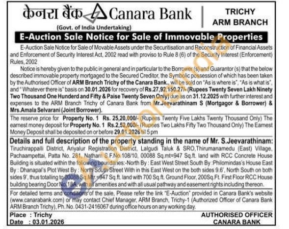 Details and full description of the property standing in the name of Mr. S.Jeevarathinam: Tiruchirappalli District, Ariyalur Registration District, Lalgudi Taluk & SRO, Thirumanamedu (East) Village, Pachaampettai, Patta No. 281, Natham S.F.No. 108/10, 00088 Sq.mt-947 Sq.ft. land with RCC Concrete House Building is situated within the following boundaries:-North By: East West Street South By: Philomindas's House East By: Dhanapal's Plot West By: North South Street With in this East West on the both sides 9.6', North South on both sides 9, thus totalling to 00088 Sq.Mtr. 947 Sq.ft. land with 700 Sq. ft. Ground Floor, 200Sq. Ft. First Floor RCC House building bearing Door No. 18A, with all amenities and with all usual pathway and easement rights including thereon