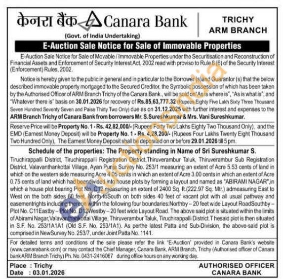 Tiruchirappalli District, Tiruchirappalli Registration District, Thiruverambur Taluk, Thiruverambur Sub Registration District, Valavanthankottai Village, Ayan Punja Survey No. 253/1 measuring an extent of Acre 5.53 cents of land in which on the western side measuring Acre 4.05 cents in which an extent of Acre 3.00 cents in which an extent of Acre 0.75 cents of land which had beendivided into house plots by forming a layout and named as "ABIRAMI NAGAR", in which a house plot bearing Plot No. C12 measuring an extent of 2400 Sq. ft. (222.97 Sq. Mtr.) admeasuring East to West on the both sides 60 feet, North to South on both sides 40 feet of vacant plot with all usual pathway and easementrights including thereon within the following four boundaries: Northby-20 feet wide Layout RoadSouthby-Plot No. C11Eastby-Plot No. D12Westby-20 feet wide Layout Road. The above said plot is situated within the limits of Abirami Nagar, Valavanthankottai Village, Thiruverambur Taluk, Tiruchirappalli District. T hesaid plot is then situated in S.F. No. 253/1A1A1 (Old S.F. No. 253/1A1). As perthe latest Patta and Sub-Division, the above-said plot is comprised in NewSurvey No. 253/7, under Joint Patta No. 1141.